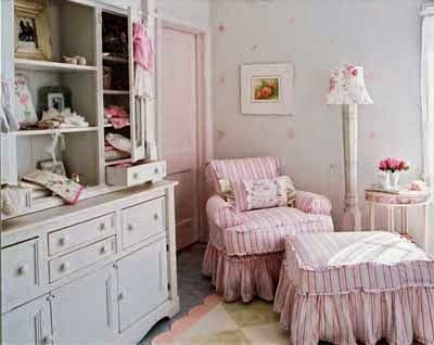 Покрывала на кроватях могут быть цветными (но оттенок – только пастельный), шелковыми и достаточно роскошными. Их часто дополняют рюшами и драпировками. Кровати и диваны украшают диванные подушки в шелковых чехлах – розовые с белыми ангелочками или белые с розочками. Хотя возможны, конечно, и другие варианты.